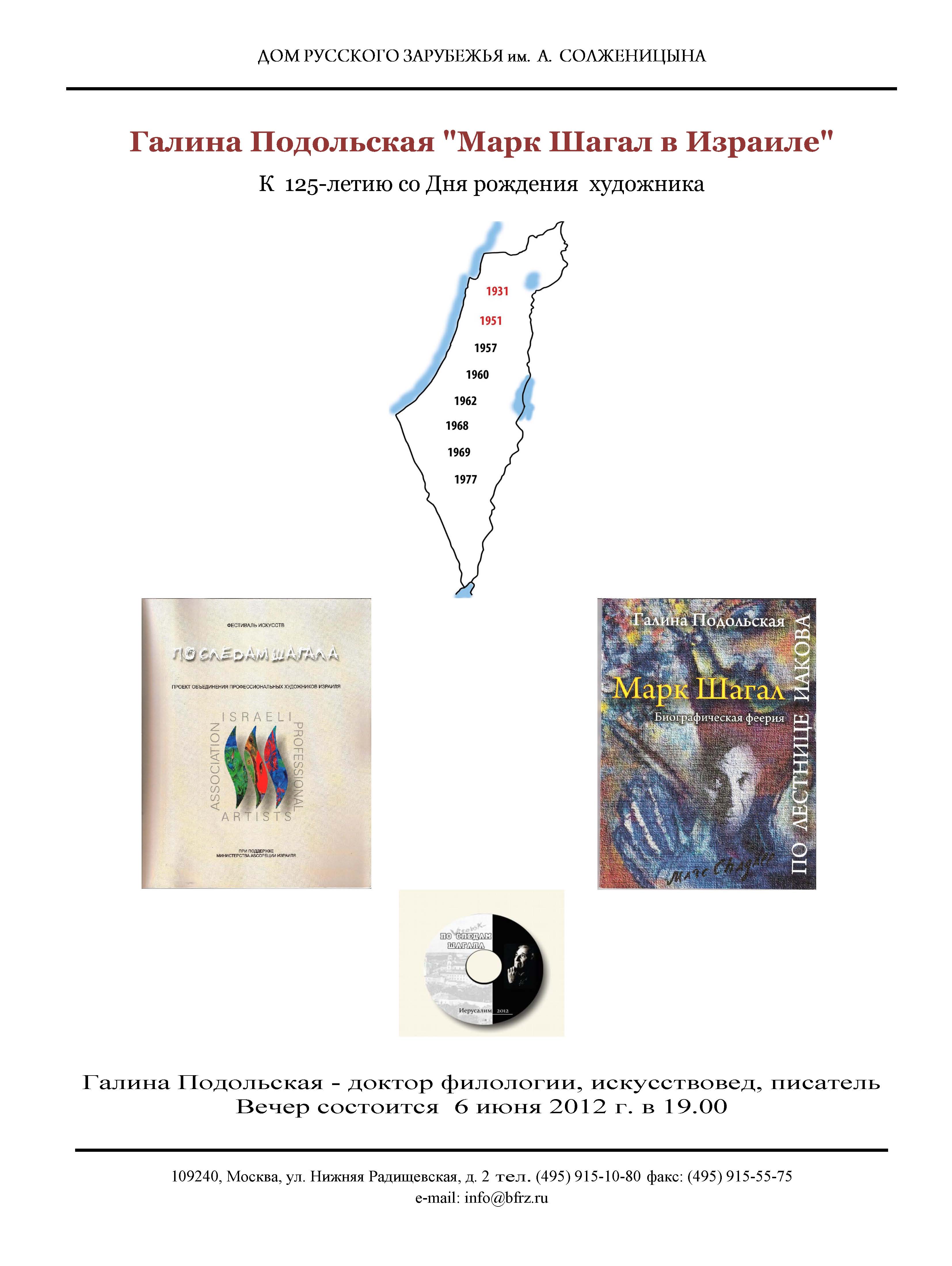 В Доме русского зарубежья имени А.Солженицына состоялось два вечера Галины Подольской – 22 мая презентация книги "Современное Израильское изобразительное искусство с русскими корнями" и 6 июня вечер, посвященный пребыванию М.Шагала в Израиле и влиянию его творчества на современное израильское искусство.